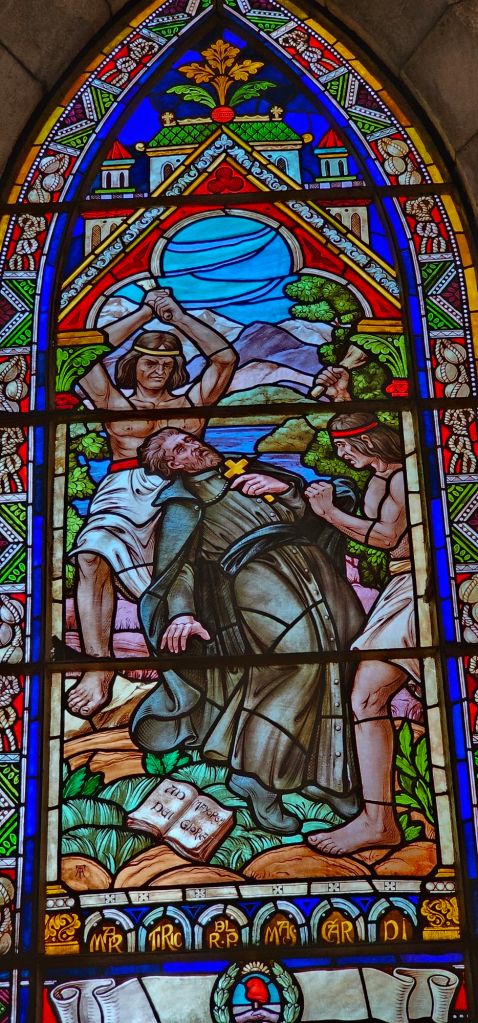 Edit: I just went back and went inside. I love stained glass, but church scenes sometimes make me upset when they portray the church interacting with native groups, so I can appreciate the one where the natives are stabbing the missionary. I know that’s a controversial statement.