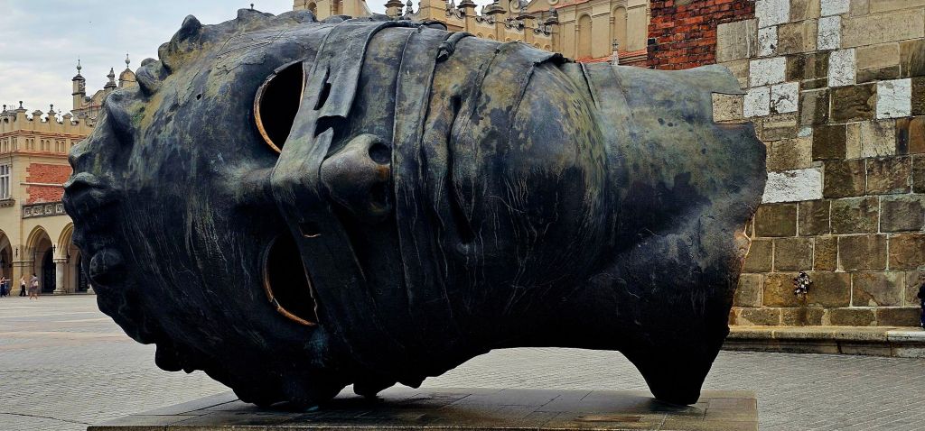 Right out front of the tower is a big brass head. Eros Bendato | Kraków Sightseeing | Krakow (inyourpocket.com)