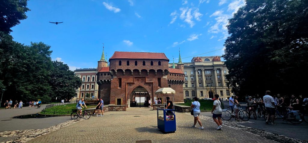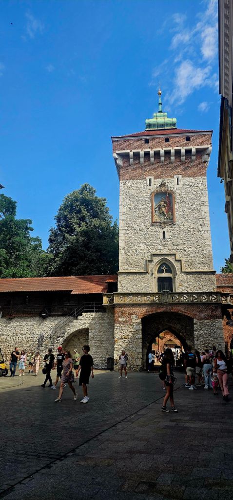 I walked along Florianska Street towards the Florian Gate. The street has a variety of architecture styles and is filled with restaurants, pubs, and souvineer shops.