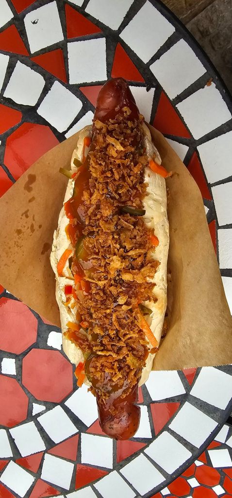 For lunch, I over did it with more perogies, but these ones were potato, cottage cheese, and onion, so more what I was expecting and a giant polish sausage on a bun I only ate half the sausage and gave the other half to a gentleman who was looking in the garbage for food.