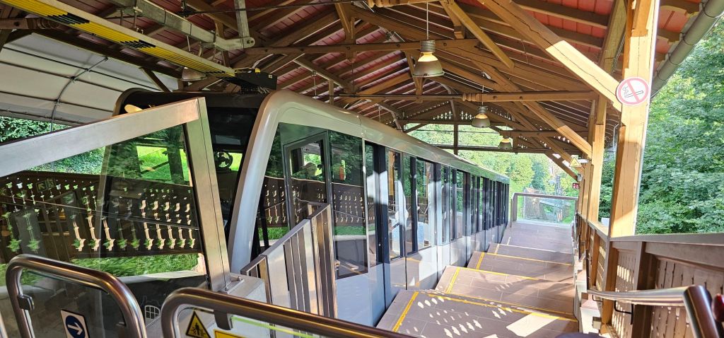 I took the funicular down the mountain, and it goes part way on the historical train, and then I needed to switch to the modern funicular to get to the castle ruins. The historical one goes slower and has a conductor driving. The newer one is all automated.