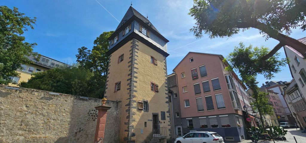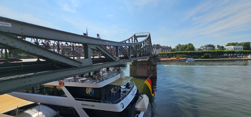 Across the street from the Custom Tower is the river Main. To connect the Old Town with the Sachsenhausen district a bridge was built called the Iron Bridge or Eiserner Steg (1868). The original bridge was blown up in the last days of the war and was the first bridge to be rebuilt in 1946.