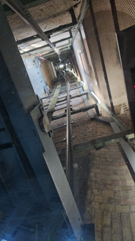 It has a tower that is 97.73 meters tall and offers panoramic views of the city. It costs 4 euros to go up the tower with a combination of regular elevators or stairs to the third floor and then another special elevator that ascends at a 17-degree angle for 50 meters. Finally, there are several sets of spiral staircases to climb up.