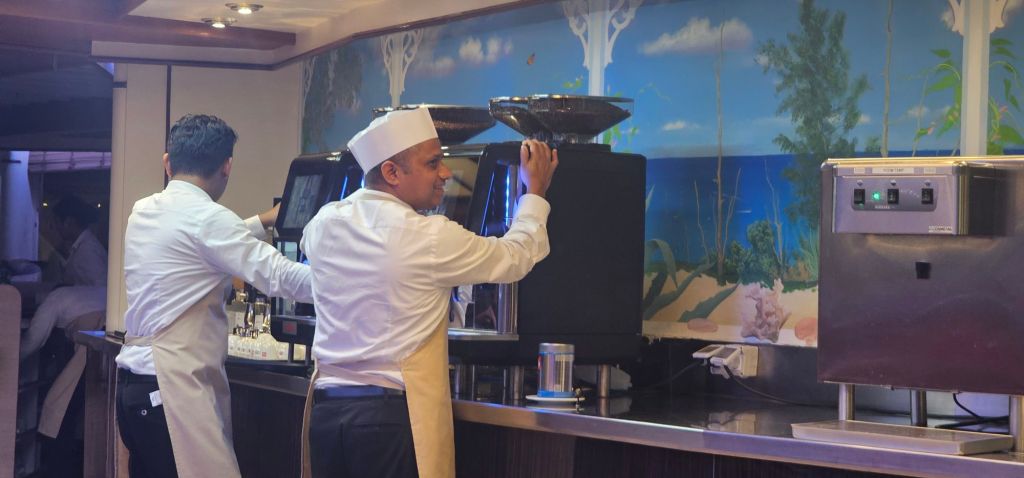 That night at departure, our ship needed to make a pretty tight turn to leave the port. To do this, the engines and thrusters were working overtime, and in the dining area above the engines, everything was shaking like crazy. Workers were holding the coffee machines and glasses onto the counter. One plate and even a ceiling panel were casualties.
