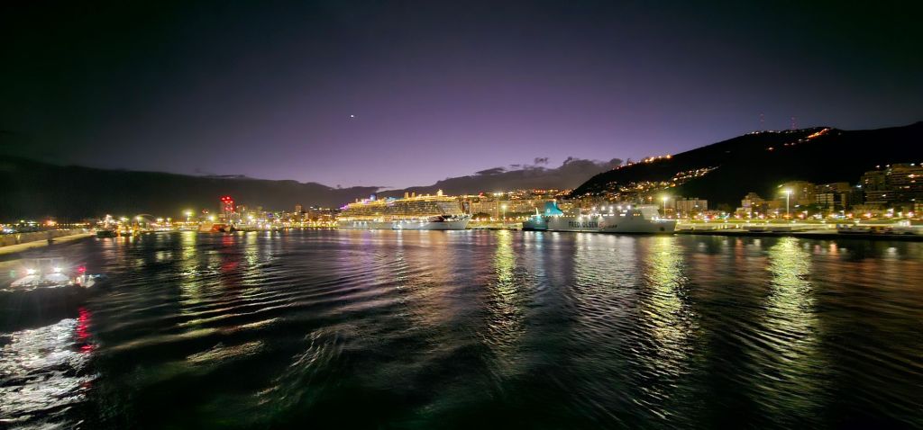 From here, I made my way back to the port and boarded the Odyssey. Our farewell at dinner showed off the island draped in sparkling lights as we headed off to Africa for our next port of call in three days.