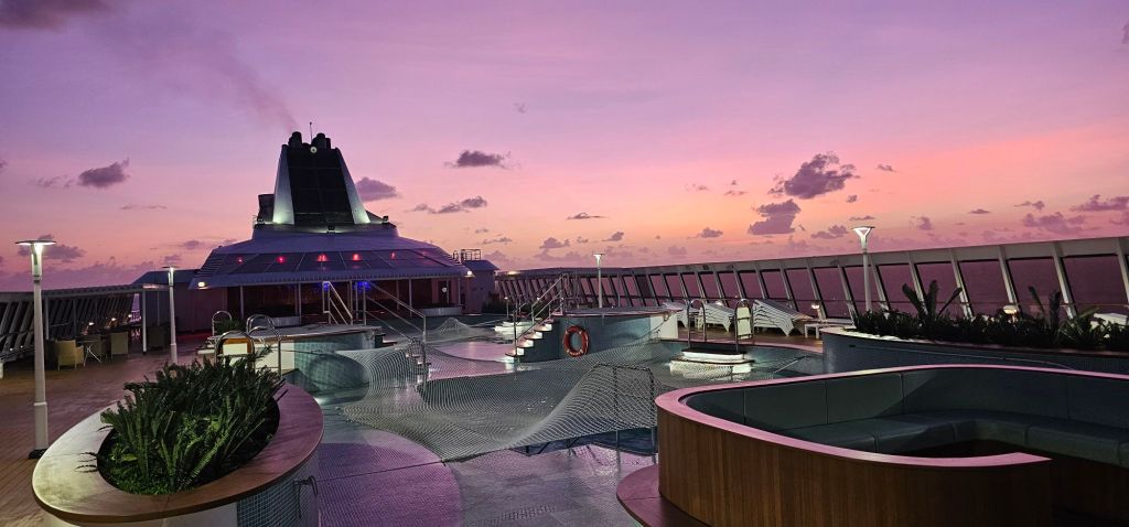 At 5:30, when I next peeked at the screen, the sun was beginning its accent. The start is the most colorful part of a sunrise, and I wanted to see it but didn’t want to commit to being up, so I went to the 8th deck in my nightgown. I grabbed a few pictures and then went back down to my room at 6:00 a.m. to get ready for the day.