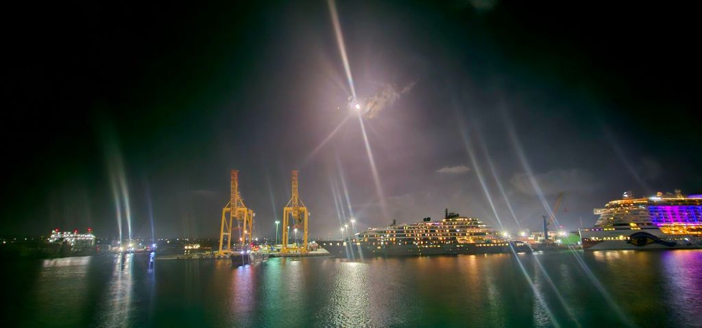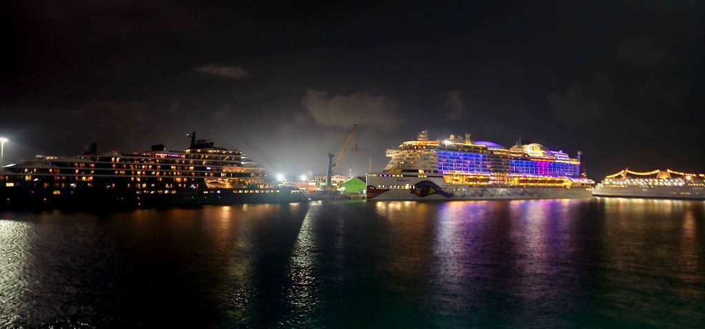 At dinner, it was dark, and the other ships at berth made for a great light show. We had a delayed leaving from the dock and were soon on our way to Grenada.