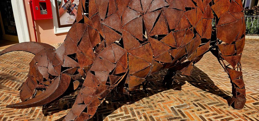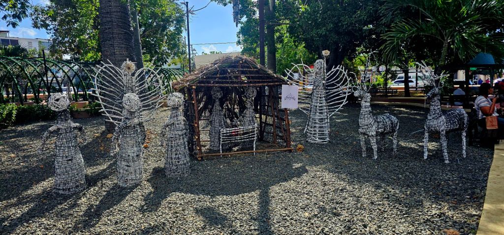It is decorated with many Christmas decorations and lights. There are also more iron statues and a statue of Duarte.