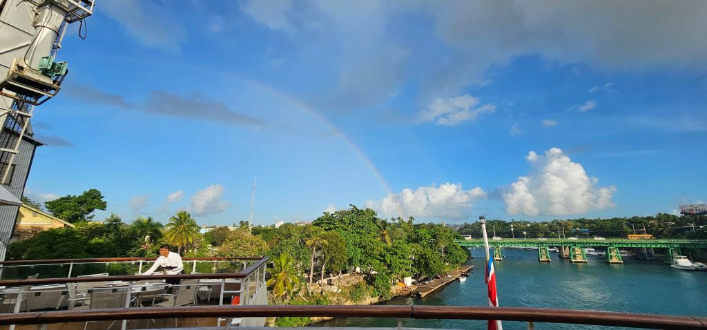 By 5 a.m., the Odyssey was pulling into our port on the west dock in La Romana. A very short rain burst at breakfast gave us a brief rainbow of welcome.