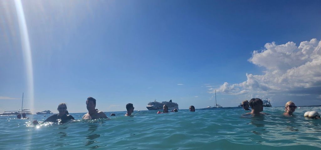 About 3 o’clock, the tenders came to get up to return us to the catamarans, and again, I struggled to get myself into the damn boat. I mistakenly listened to the man who said to step up onto the boat when I should have sat on the edge and twisted in. Live and learn.