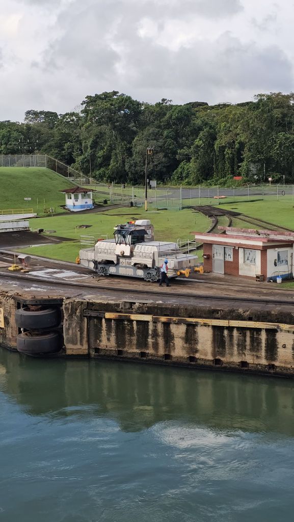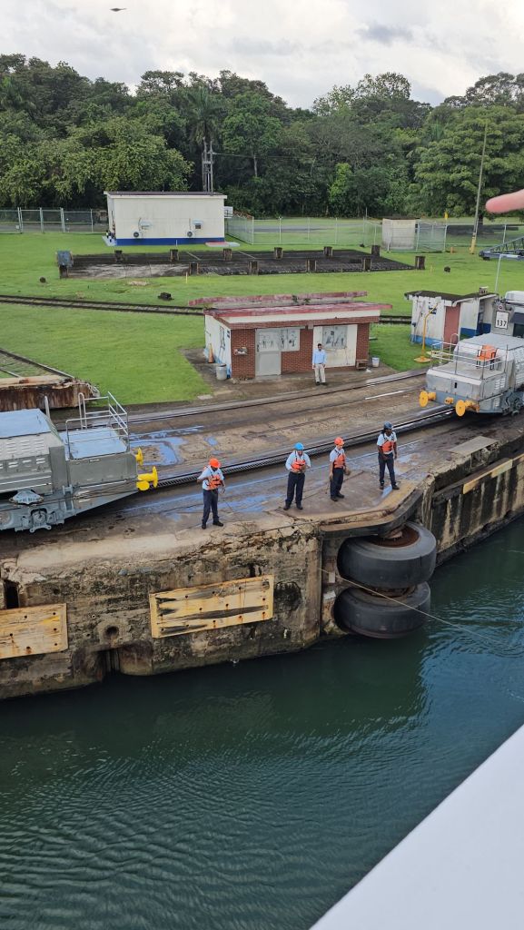 The Gatun locks are a three-stage flight of locks that lift the ships to the Gatun Lake level, 26.5 meters above sea-level. It took us about 1 hour to enter and then exit the first stage and then an additional hour to complete the next two stages.