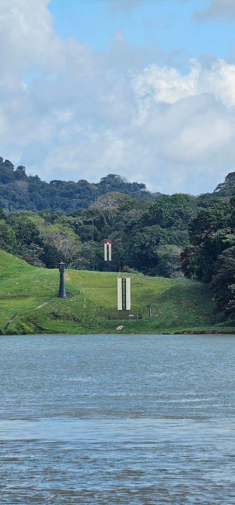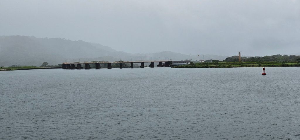 Once completed, we entered the Gatun Lake, an artificial lake formed by building the Gatun Dam. It was rainy and foggy when we reached the lake, and we needed to wait until the fog lifted before continuing.