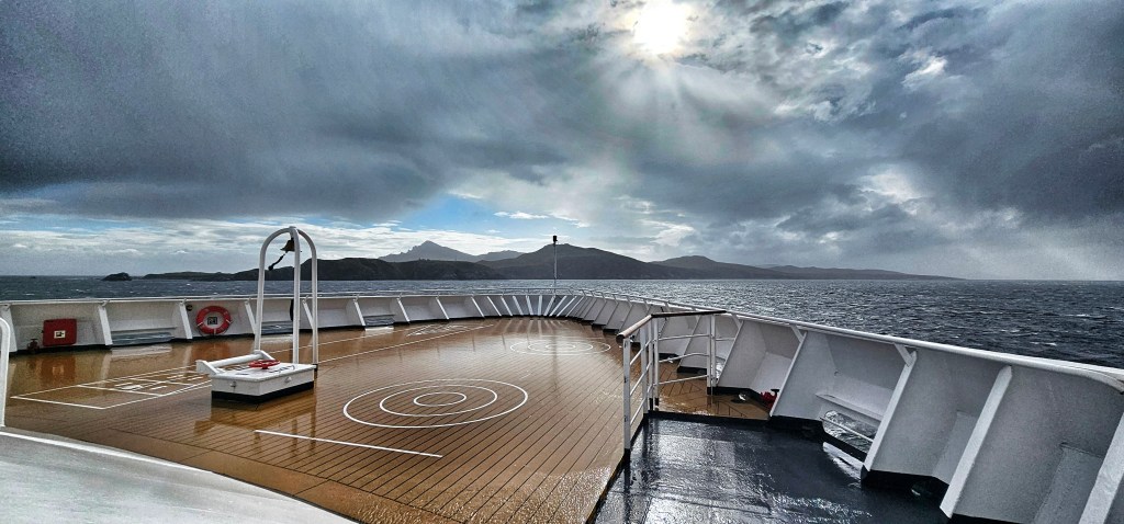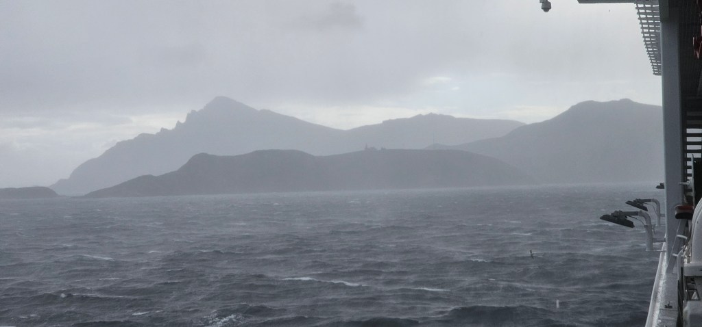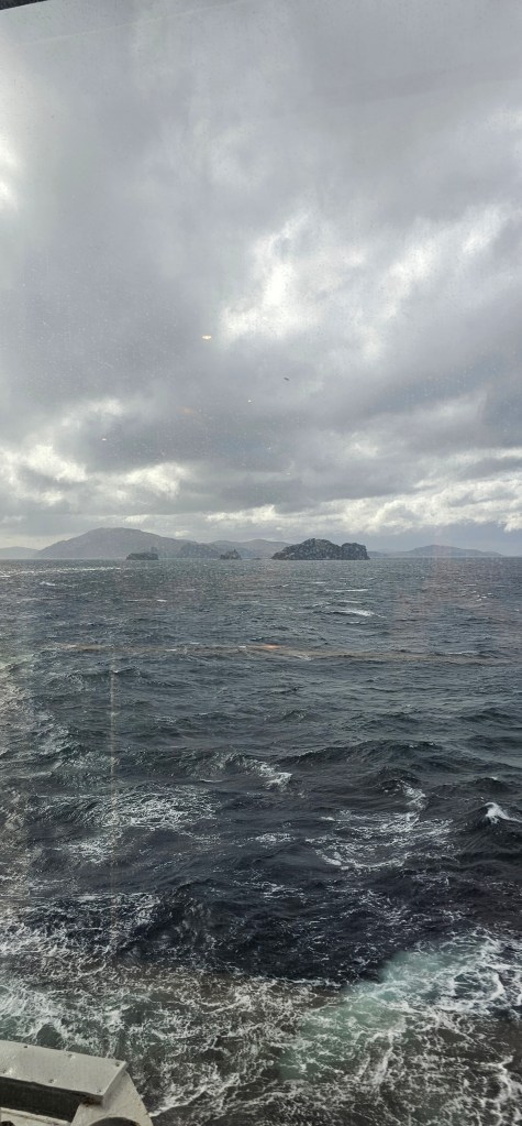 It was incredibly windy at the front, and rain would come and go, lashing anyone outside. The clouds and fog made the island appear and seemingly disappear from sight moments later.