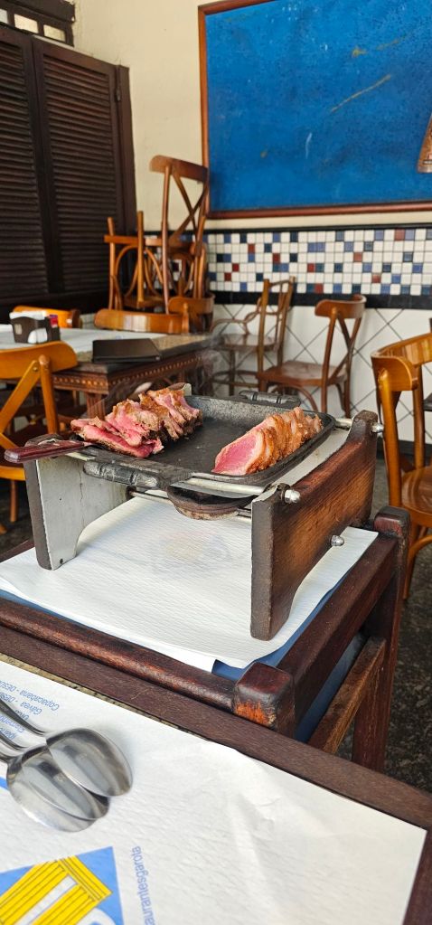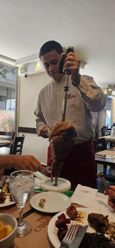 Well, no trip to Brazil would be complete without a barbecue meal. In Brazil, it is, of course, not called Brazilian barbecue. You know the barbecue or the waiters come to the table with meat on skewers and cut you off pieces. Or you have a little coloured disc, green on one side to say give me more meat, and red when you’re finally finished.
