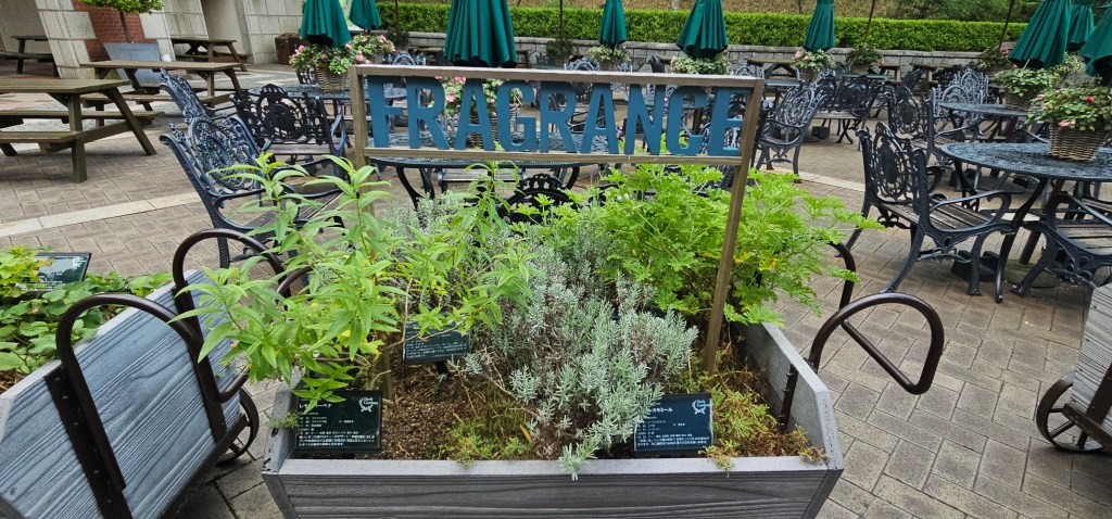 The next morning, I decided to head out with Claude and Paul to the herb garden, which was on top of a hill, so it was a little bit cooler. We did walk to the base of the hill, and it was again very hot, so we decided not to climb the hill but take the gondola up (1,400 yen) and return by walking.