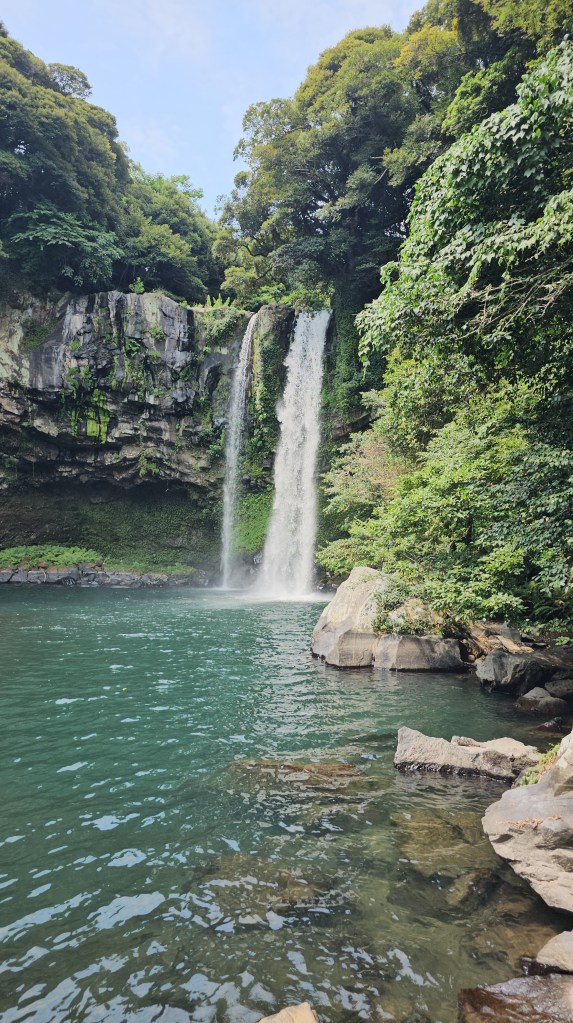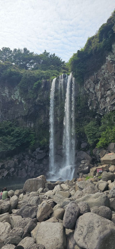 From this waterfall, we took an Uber for 5000 won to Jeongbang waterfall. This waterfall also costs 2000 to enter and requires climbing up and down 133 stairs to see the waterfall. This waterfall is special because it flows directly into the sea.