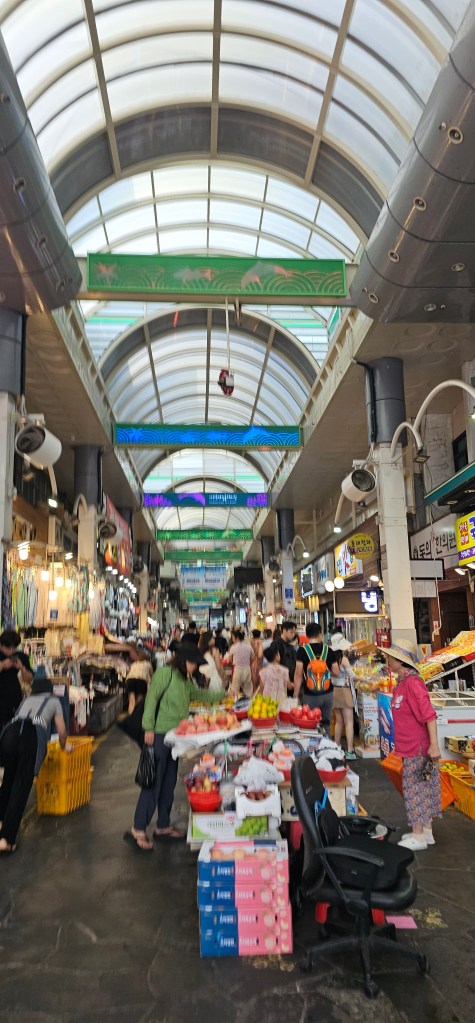 From the cruise terminal, we caught bus 680 for 1000 won, or basically a dollar. In about 25 minutes, we were at the market in Segwipo called Maeil Ollie Market. From there, we are about a 15-minute walk to the Cheonjeyeon waterfall.