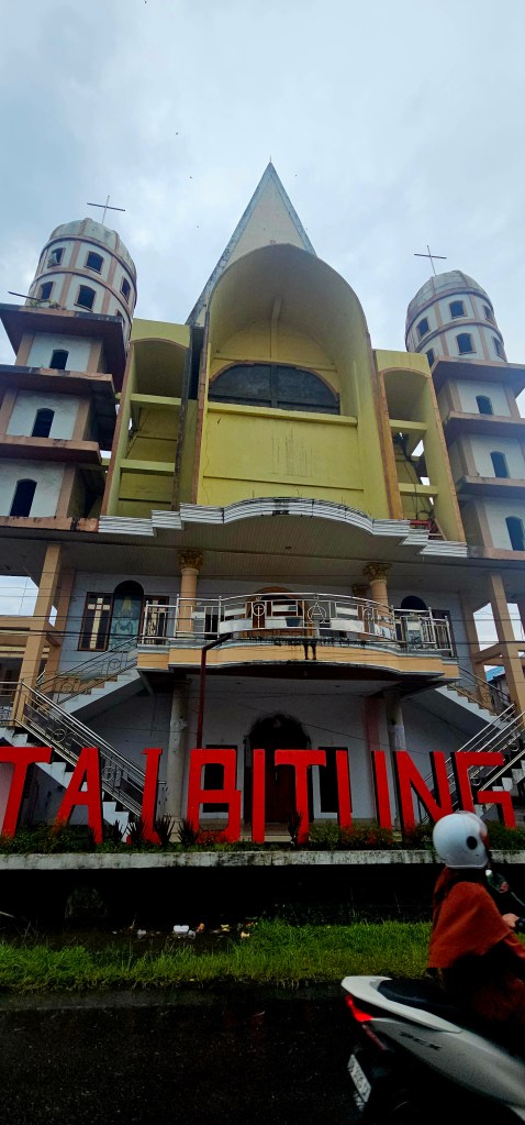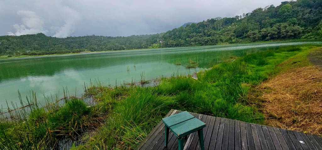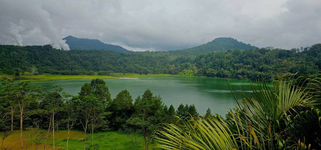 We visited Lake Linow. Here, there is a cafe at the top of a lake which charges an entrance fee of 40,000 rupiah, which includes a free coffee or tea at the top. There is a lookout of a lake, and depending on the amount of sun available, the colour of the water will change as it is also fed by hot pots and springs. The cafe used to be at the base right along the side of the lake, but it was forced to relocate higher up due to government regulations. The old building still stands, and you can go down there to get a better view of the lake, but it is not maintained anymore.