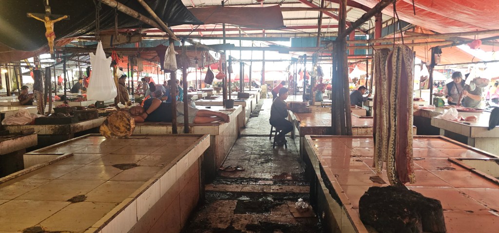 We finally arrived at the extreme market, and much to our dismay, the only two meat items that they had or boar and snake. Now, if they had had a cat, we didn’t want to see it, but we did want to see the bats because they were supposed to be bigger than the fruit bats that we had eaten at the last place.