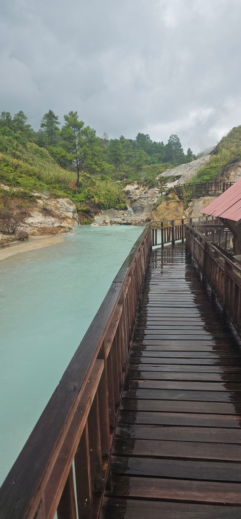We walked slightly down the path and watched the river, the cool river water that flows beside, interact with the hot springs water. So you could do like a sauna, where you sit in the hot water and then go out and dip in the cool water, and then go back into the hot water and vice versa. At this point, it was raining pretty good so we decided to head off towards the lake.