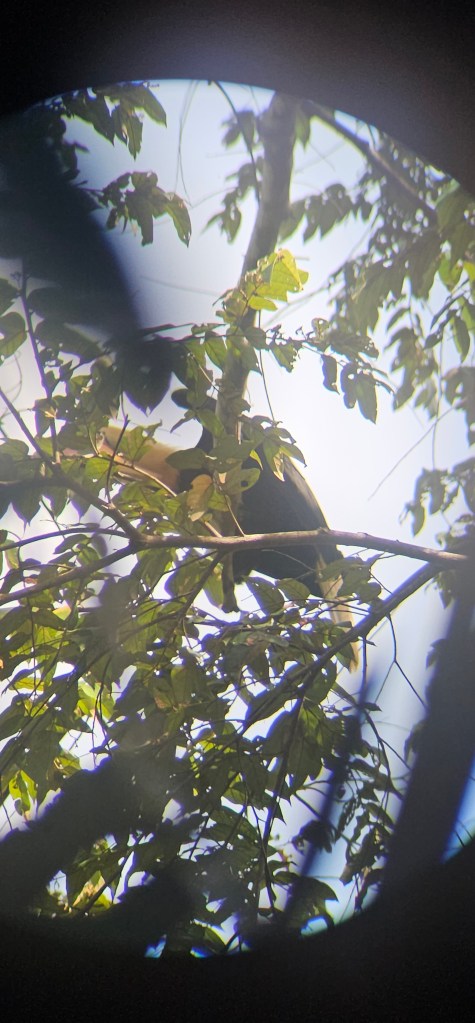 Our hike for the elusive toucan continued up and down hills. The sweat was really starting to pour out, and my entire outfit was completely drenched. At one point, our guide left us in one location, and he and his wife went out looking for the toucan. I guess we were too loud before returning to get us to bring us to the Toucans’ location. The birds have a loud clacking call and can be easily heard throughout the forest, but spotting them through the leafy canopy is not an easy task.