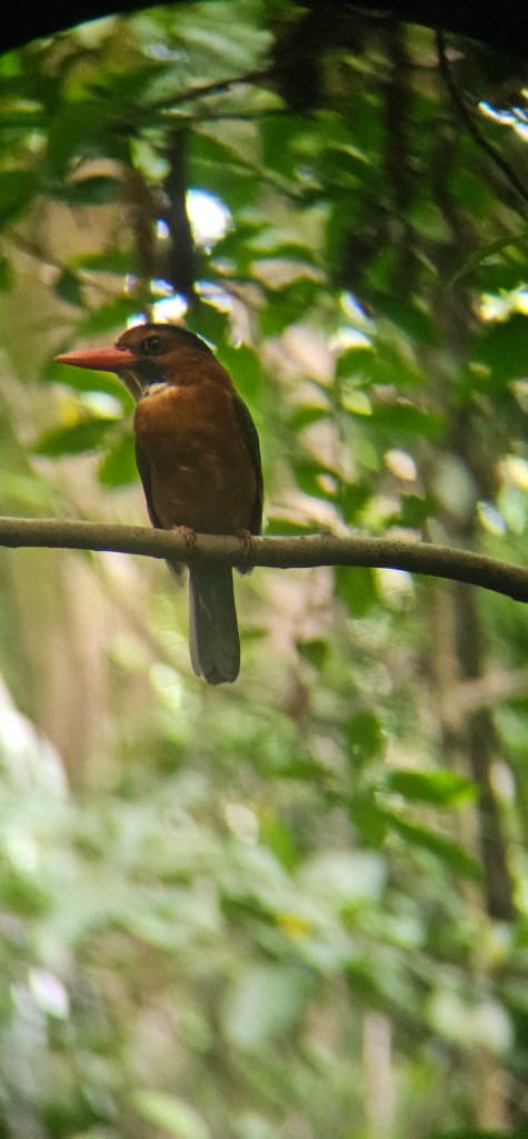 The walk began on a stone path and which eventually led to a dirt path, but still level and easy to walk on. As we walked along, the giant green trees sheltered our walkway, and the humid air made me quickly begin perspiring. About 10 minutes into our stroll, the wife spotted our first animal, which was a Kingfisher bird. Even with them pointing out where the bird was, I still couldn’t really see it, and I can’t believe she spotted this from the path. It is absolute proof that the guides are essential for spotting wildlife.