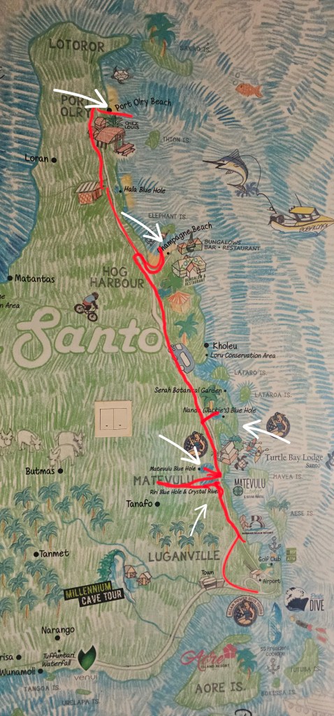 One of the things to do on Santos is visit the 3 blue holes: Riri, Jackie’s Hole/Nando, and Matevulu Blue Hole. The blue holes are created by underwater sinkholes when limestone caves collapse, and the waters are clear and intensely blue. All of the land is privately owned, so just about everything costs money to enter. The advantage is that the families want people to visit, so they somewhat caretake the site and have built small huts for changerooms and toilets.