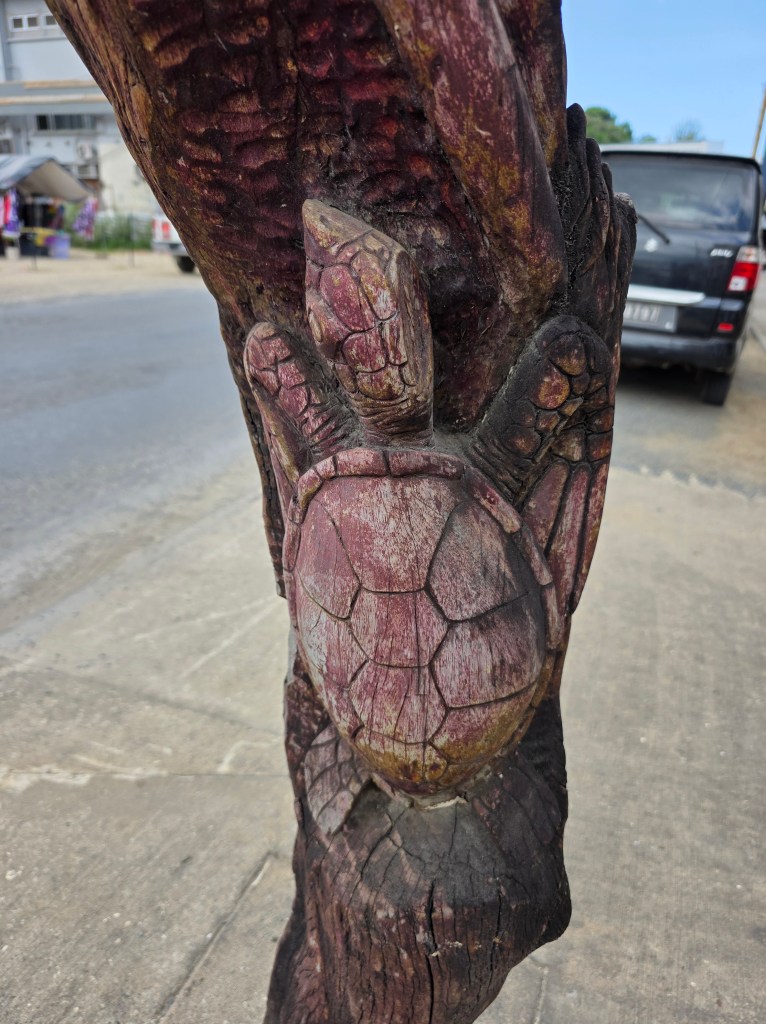 Around town, there are many carved trees. I don’t know if they were carved in situ from damaged trees or carved elsewhere and relocated to the wharf walkway.