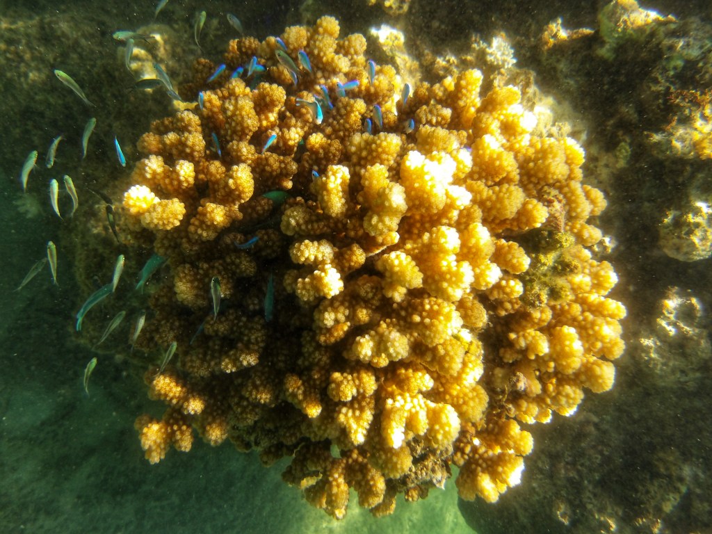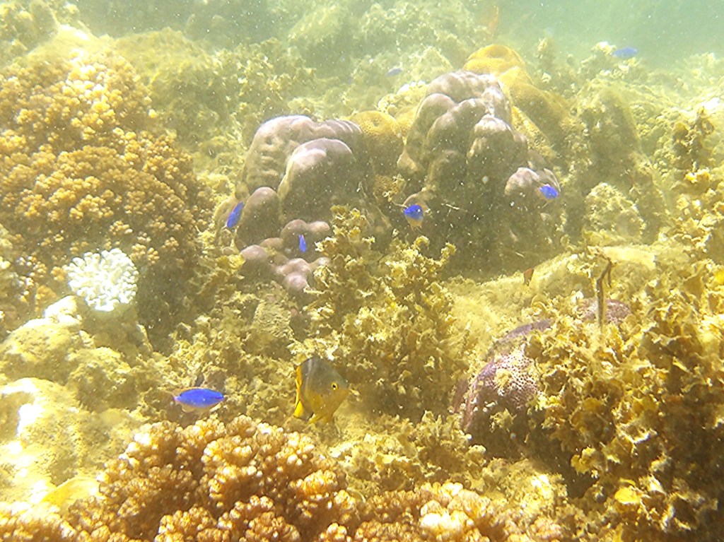 The coral right by the entry is tan and looks sick, probably from everyone stepping on it to get in. There are a few fish about, but I needed to swim out further to find the coral batches and more fish. It was a bit murky in the water, and visibility wasn’t awesome, but I finally had my underwater camera working and couldn’t wait to try it out.