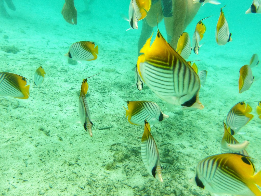 Our second stop was to swim with sting rays and sharks. Just some black tip sharks. There was also a group of yellow butterflyfish. Our pilots were feeding the fish so they stayed in swarms around them.