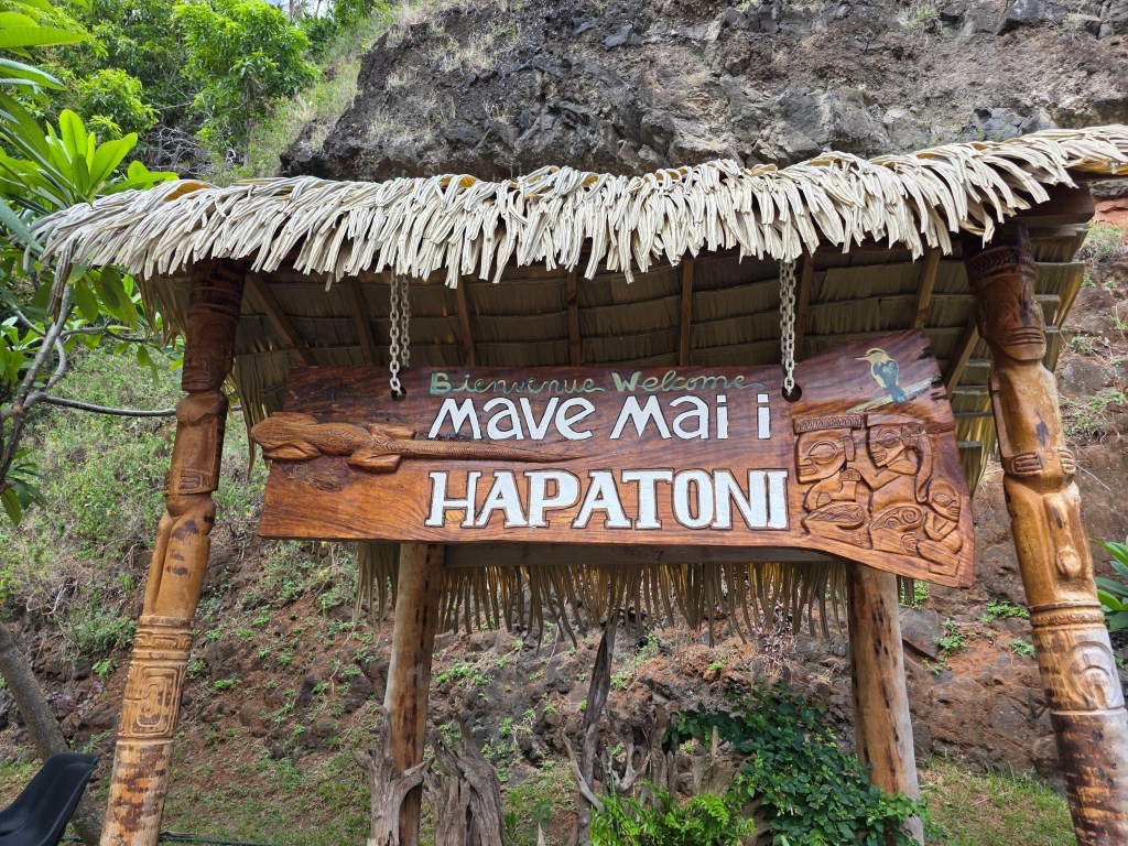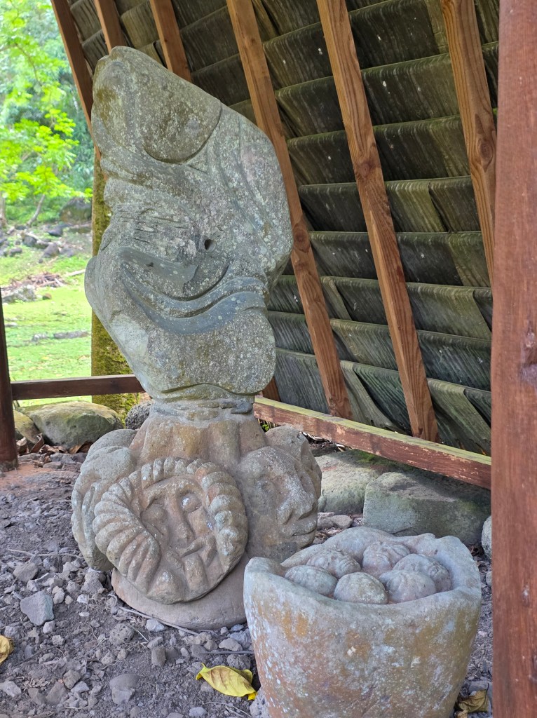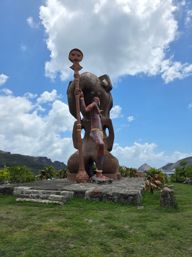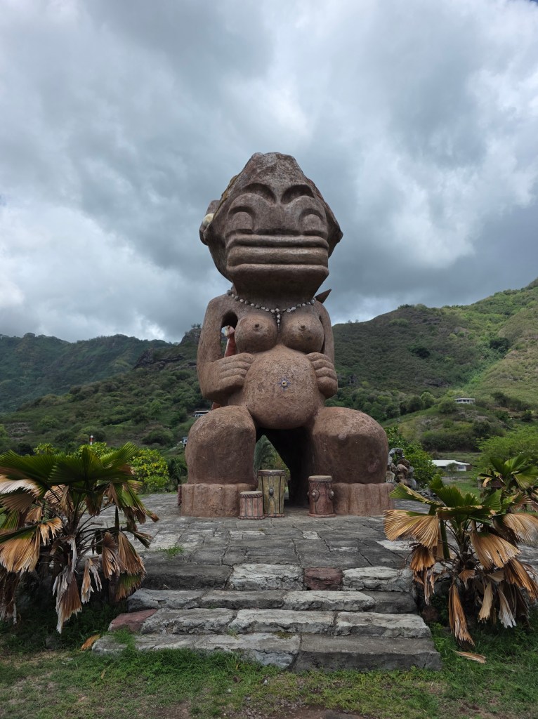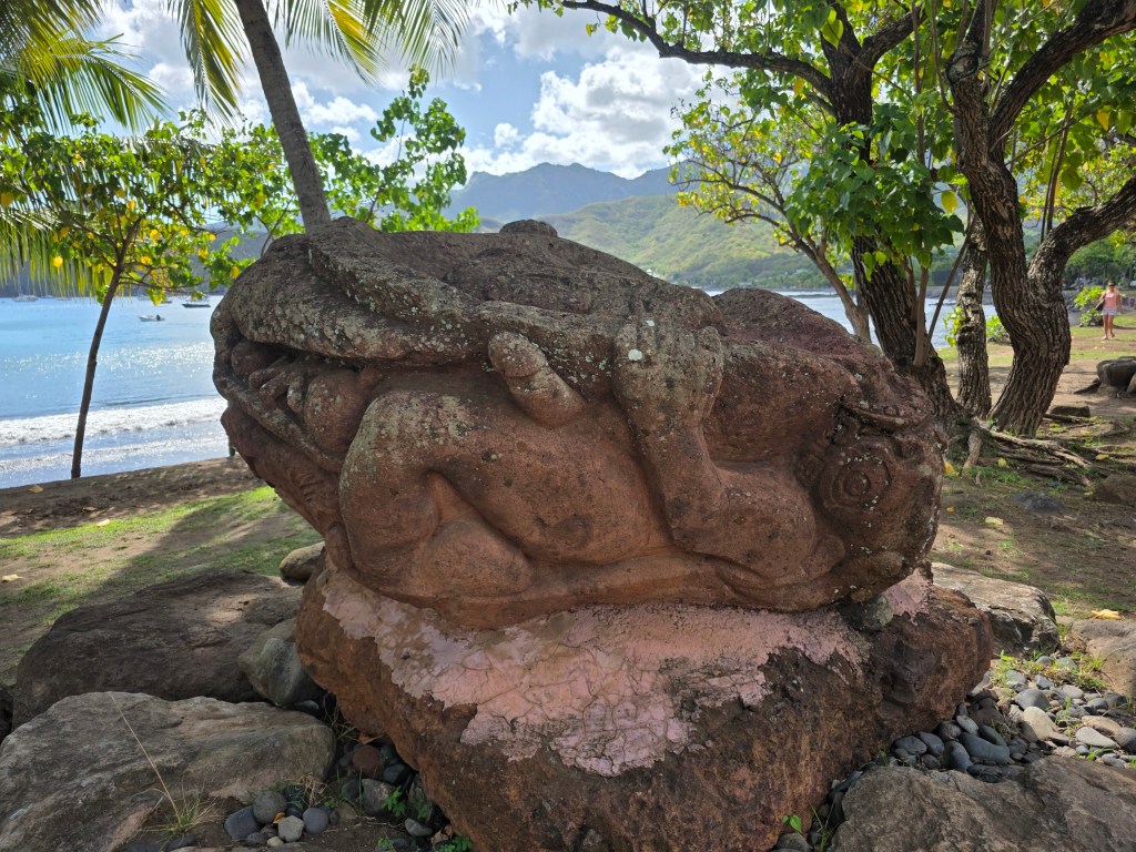 This Tiki Tuhiva is of two figures. The largest, a female, a guardian of tradition and knowledge. The smaller male is a warrior figure. Tiki figures are common here and can be found scattered throughout the island. Tikis are humanoid figures that represent deities, ancestors, or historical figures in Polynesian culture.