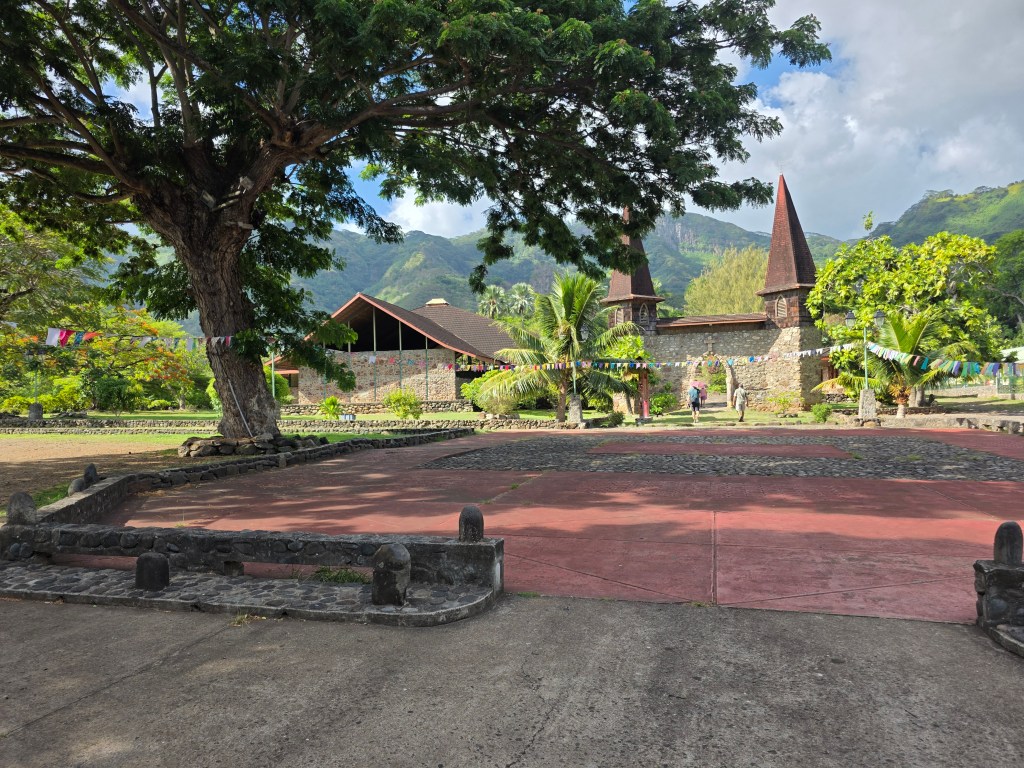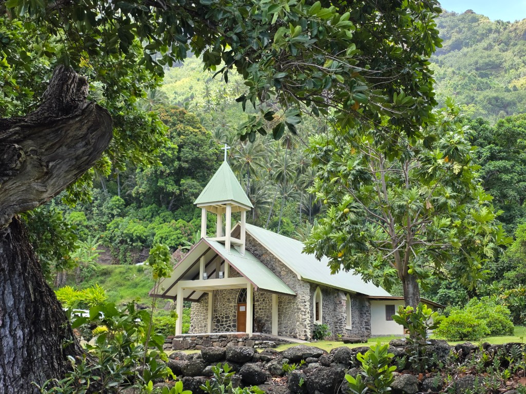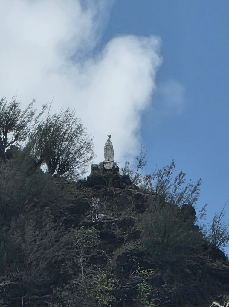 From there, we made our way to the next valley of Hatiheu. Again, we stopped multiple times to take in the panoramic views. It is on the North of the island and has a statue of the Virgin Mary hoisted 300 meters high on a basaltic ridge.